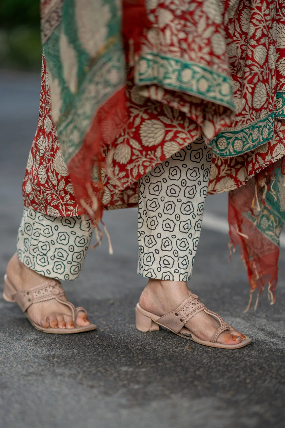 A stunning Bagru Hand Block Cotton Anarkali Suit Set featuring floral hand-block motifs, a bordered V-neckline, coordinated printed pants, and a statement dupatta for an effortlessly elegant ethnic look.